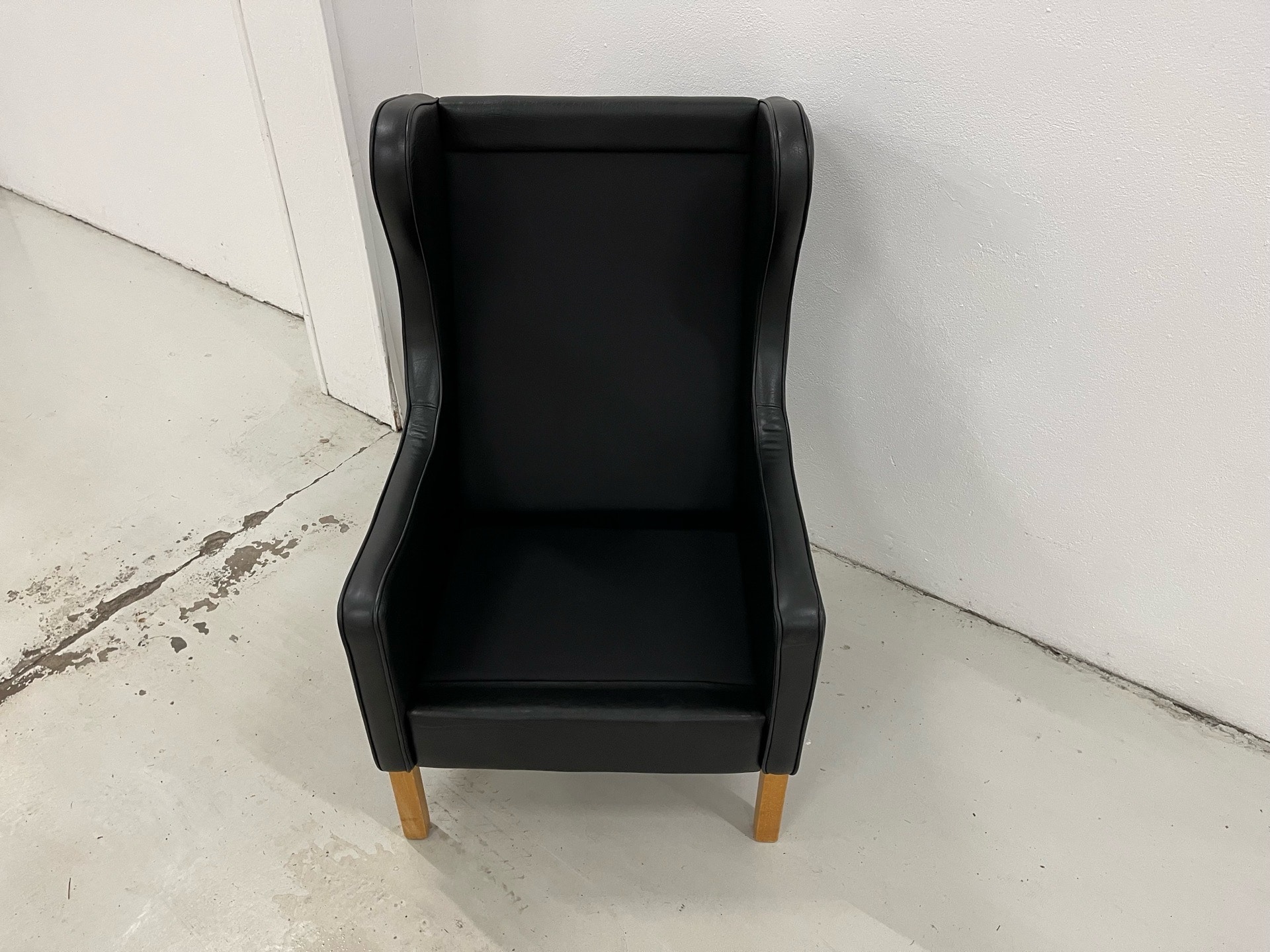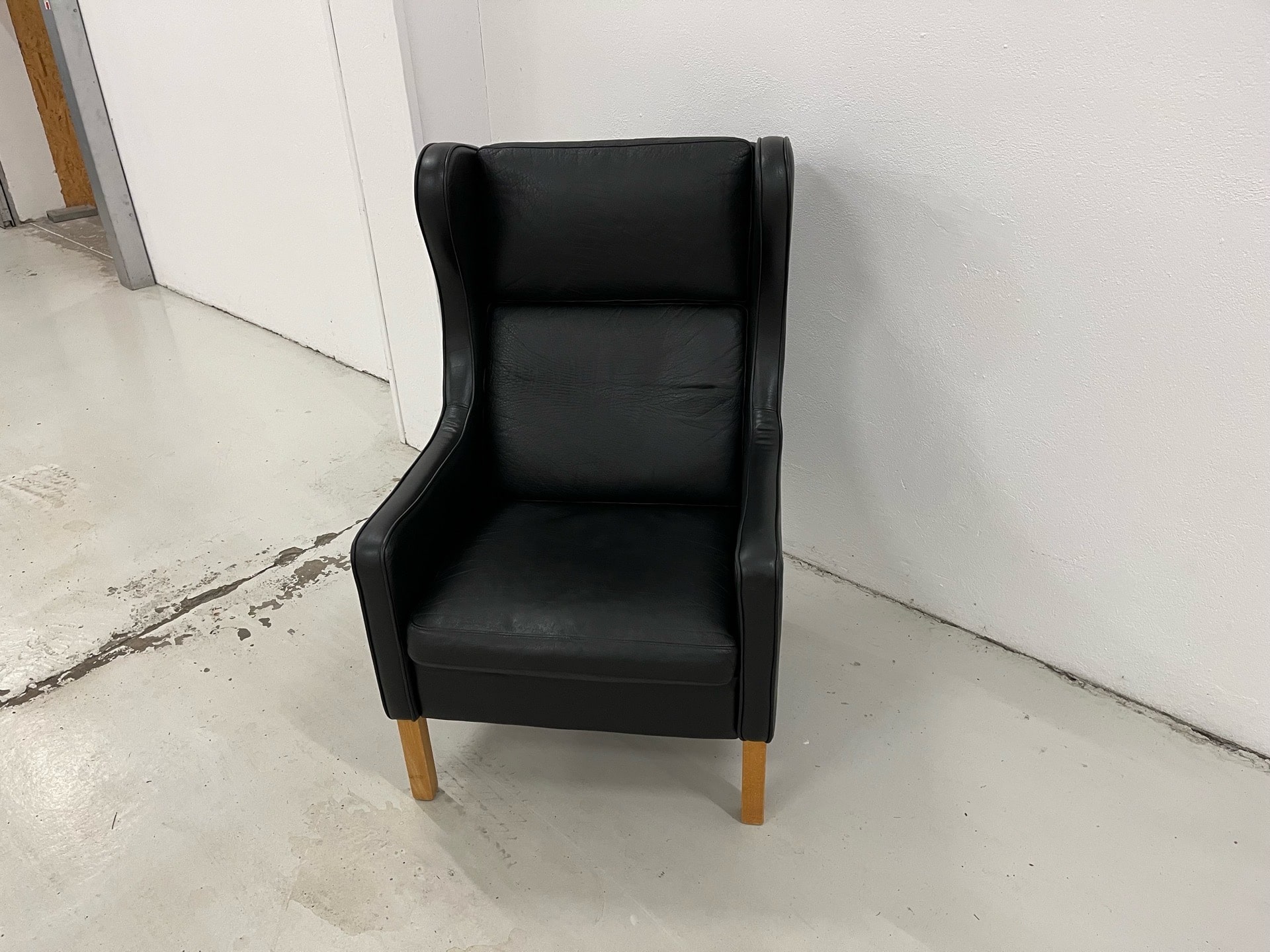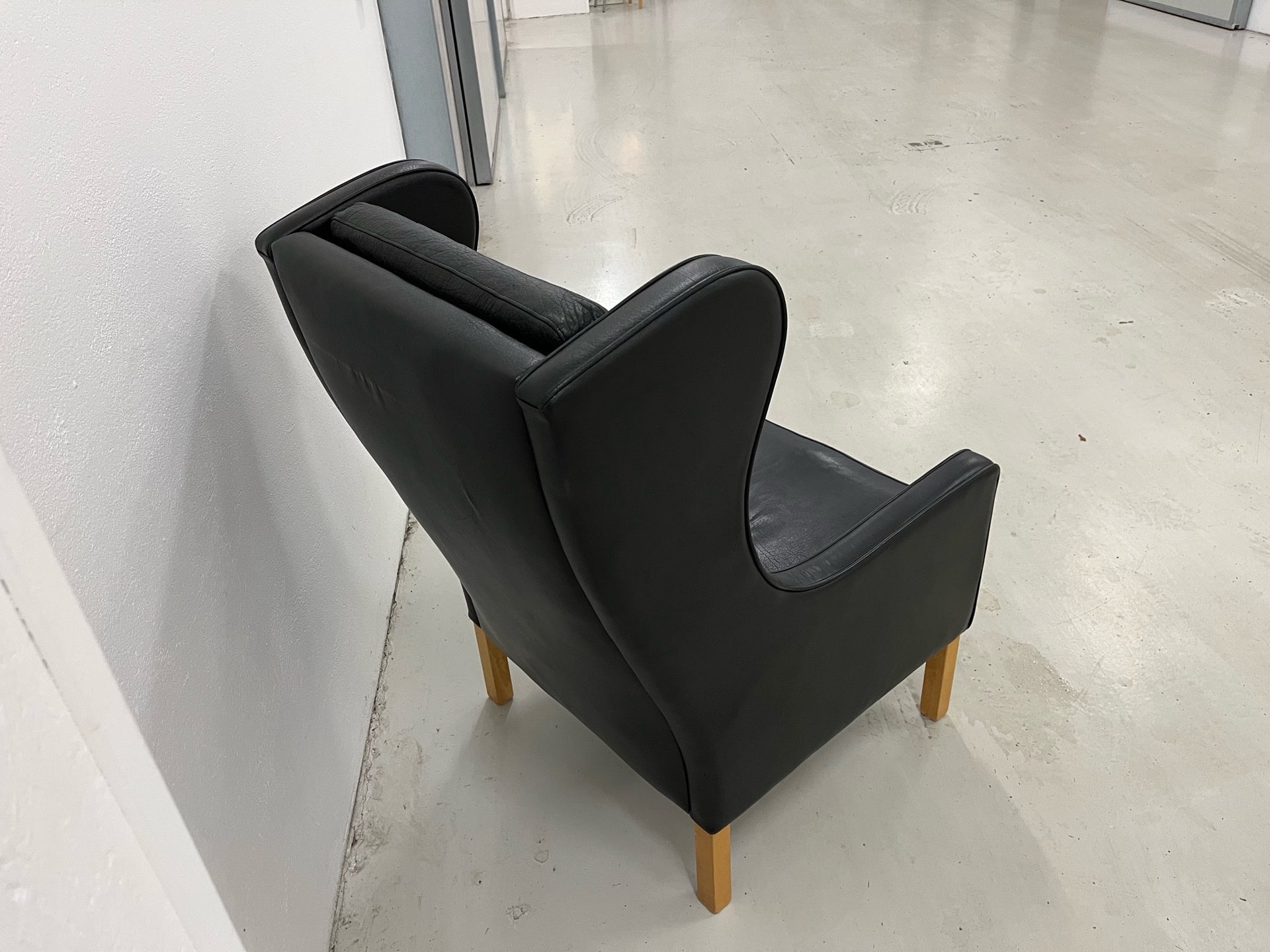 Mogens Hansen MH195 øreklapstol i sort mammut læder og med ben i bøg.Pris 11.000,-