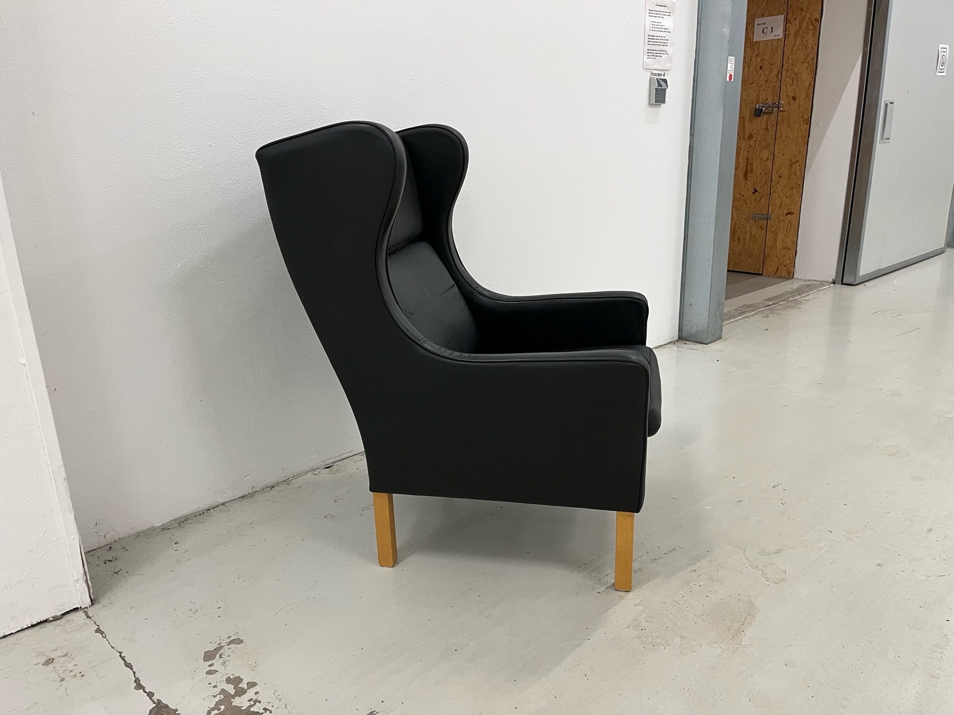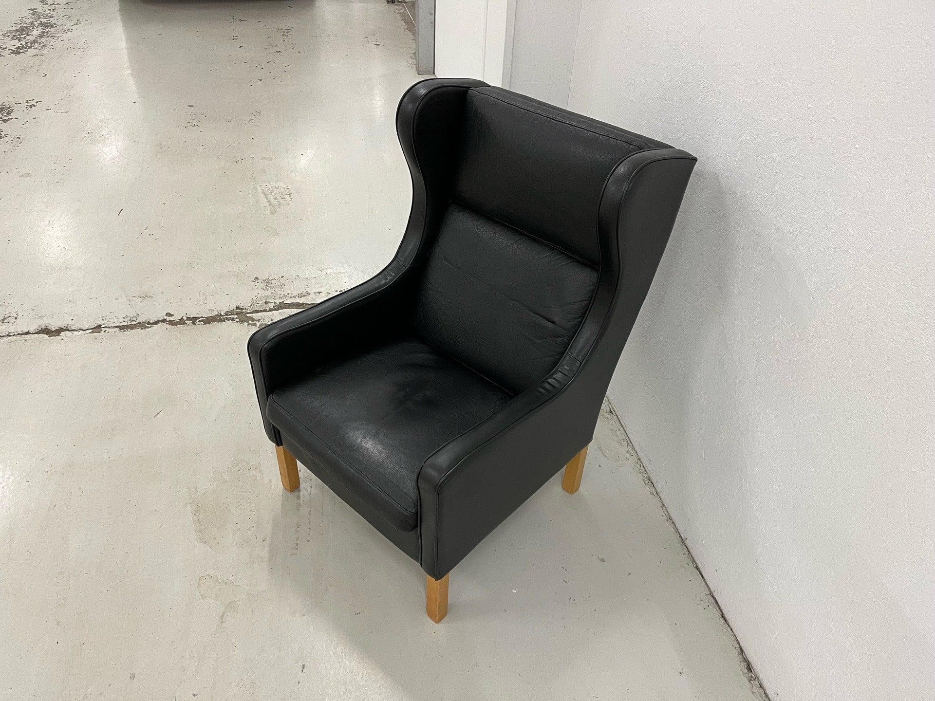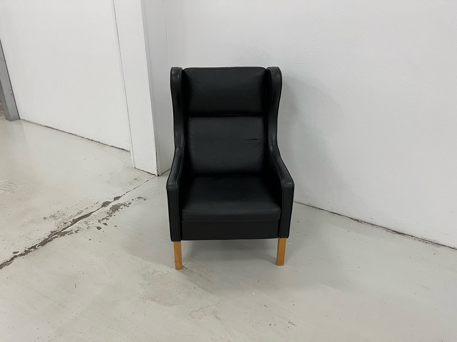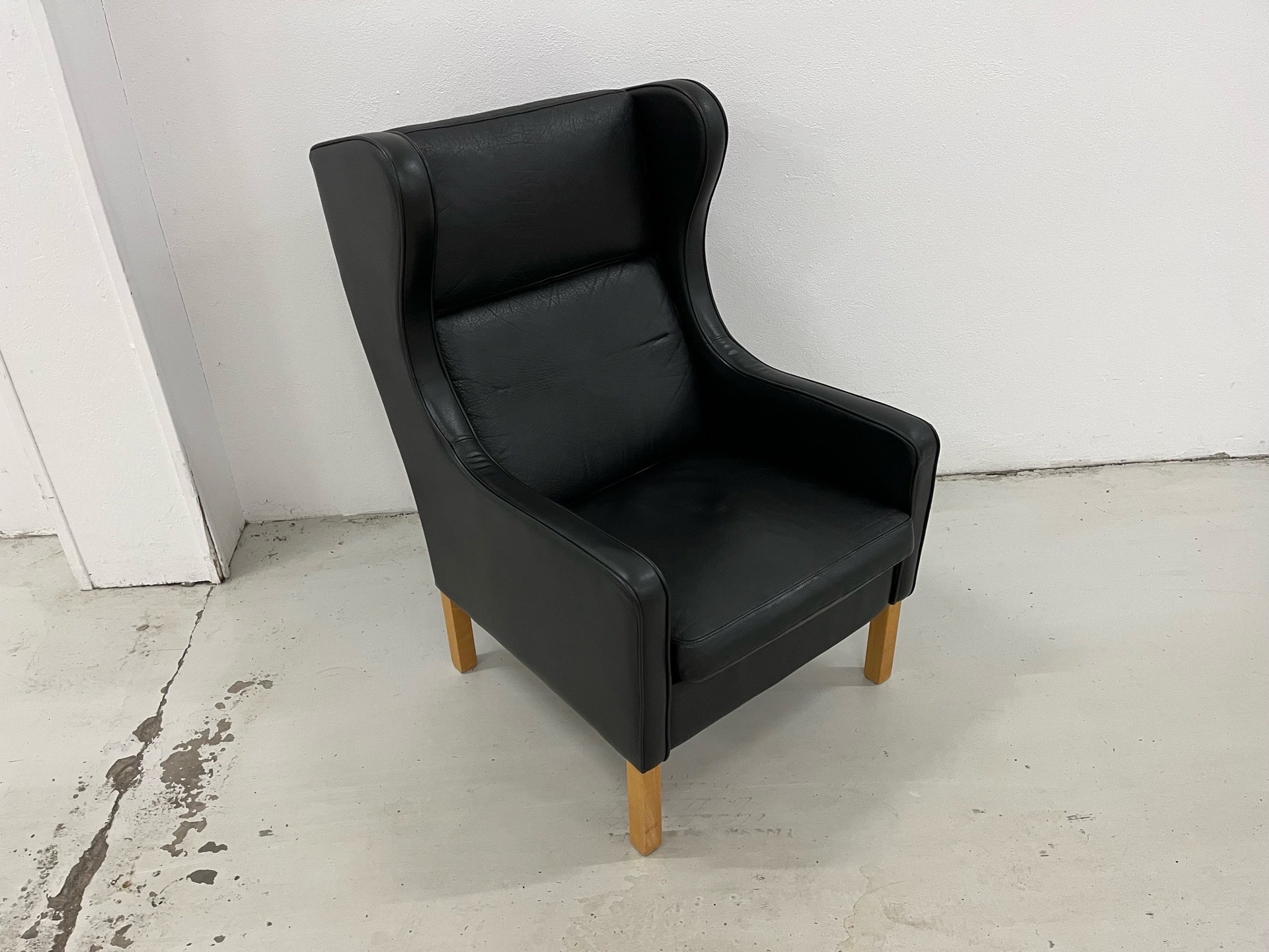 Mogens Hansen MH195 øreklapstol i sort mammut læder og med ben i bøg.Pris 11.000,-